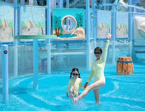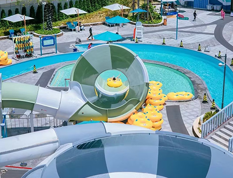 項目簡介:海南威珀斯酒店水上樂園二期項目位于海南省三亞市清水灣大道威珀斯酒店,項目面積6300㎡,這是我們與威珀斯酒店的第二次合作,一期我們?yōu)榫频暌?guī)劃建設了一個小型水池作為兒童戲水池,二期作為一期的客群補充以及功能補充,解決一期項目面對客群少的問題,為客戶酒店打造一個綜合型的全齡水上樂園。 我們在設計顏色搭配方面,采用當下市場流行的低飽和度莫蘭迪色系;在功能搭配方面,采取多層游玩功能的結(jié)合,例如戲水水寨擁有不同高度的多個平臺,幼齡和大齡兒童都可以根據(jù)自己的喜好和能力去進行游玩;在玩法種類方面,采取休閑+刺激的體驗結(jié)合,既有適合休閑玩的懶人漂流河,也有適合釋放壓力的沖天回旋滑梯,真正讓游客在樂園里體驗到多種的玩法。 威珀斯水上樂園主要分為五個大游樂區(qū)域,當游客通過服務區(qū)進入樂園之后,會依次通過我們的兒童戲水池、親子滑梯區(qū)、沖天回旋滑梯、刺激滑梯組、漂流休閑區(qū),挑戰(zhàn)難度從一顆星到五顆星,針對不同年齡段人群不同的游玩需求,為他們配置適合的游玩產(chǎn)品。同時,我們?yōu)橛慰团鋫淞诵蓓圪u區(qū),作為游客們的能量補給站。